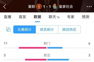 體育資訊3月14日訊 曼聯(lián)在本輪歐聯(lián)杯主場上半場1-1戰(zhàn)平皇家社會,兩隊關(guān)鍵數(shù)據(jù)如下: