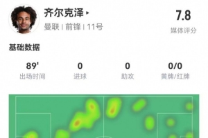 體育資訊3月14日訊 曼聯(lián)在本輪歐聯(lián)杯4-1領(lǐng)先皇家社會(huì),齊爾克澤本場(chǎng)數(shù)據(jù)如下: