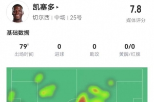 體育資訊3月14日訊 切爾西在本輪歐協(xié)聯(lián)1-0領(lǐng)先哥本哈根,凱塞多本場(chǎng)數(shù)據(jù)如下: