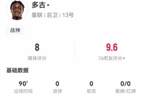 體育資訊3月14日訊 曼聯(lián)在本輪歐聯(lián)杯4-1擊敗皇家社會(huì),多古本場(chǎng)數(shù)據(jù)如下: