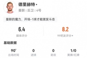 體育資訊3月14日訊 曼聯(lián)在本輪歐聯(lián)杯4-1大勝皇家社會,德里赫特本場數(shù)據(jù)如下: