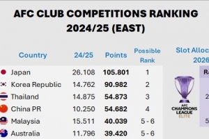 馬來超 40.039分 2026-27賽季亞冠精英聯(lián)賽名額1個