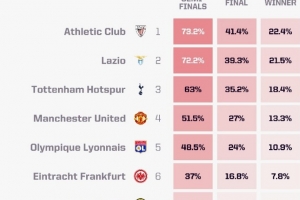 1、畢爾巴鄂競(jìng)技 73.2%、41.4%、22.4%