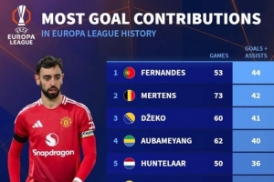體育資訊3月14日訊 曼聯(lián)在歐聯(lián)杯16強(qiáng)戰(zhàn)次回合4-1擊敗皇家社會(huì),B費(fèi)上演帽子戲法,數(shù)據(jù)統(tǒng)計(jì)顯示他已是歐聯(lián)歷史參與進(jìn)球最多的球員。