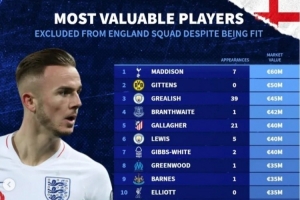體育資訊3月14日訊 圖赫爾已經(jīng)公布了他的首期英格蘭隊大名單,《轉會市場》也統(tǒng)計了落選的健康球員身價情況。