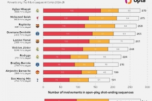 體育資訊3月15日訊 opta統(tǒng)計了本賽季五大聯(lián)賽球員各項賽事參與最終轉(zhuǎn)化為射門的進(jìn)攻次數(shù)情況,姆巴佩力壓薩拉赫居首。