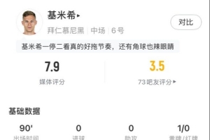 體育資訊3月16日訊 德甲第26輪,拜仁1-1戰(zhàn)平柏林聯(lián)合,基米希首發(fā)出戰(zhàn)打滿全場(chǎng),賽后獲評(píng)7.9分,僅次于獲評(píng)8.2分的奧利塞。