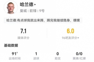 體育資訊3月16日訊 曼城在本輪英超2-2戰(zhàn)平布萊頓,哈蘭德本場數(shù)據(jù)如下: