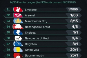 體育資訊3月16日訊 相關(guān)機構(gòu)更新了本賽季獲得英超前四的賠率情況,曼城仍被看好。