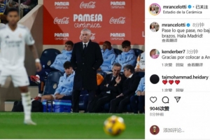 安帥曬出了自己在場邊指揮的照片,并配文:“無論發(fā)生什么,我們永遠不會放棄,Hala Madrid!”