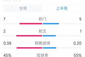 體育資訊3月16日訊 本輪英超焦點(diǎn)戰(zhàn)阿森納對(duì)陣切爾西上半場(chǎng)結(jié)束,槍手憑借梅里諾進(jìn)球1-0領(lǐng)先,以下為雙方半場(chǎng)數(shù)據(jù)對(duì)比: