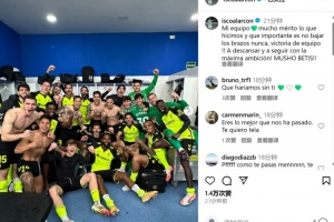 本場比賽伊斯科點射破門拉響反擊號角,賽后伊斯科也在社媒曬出更衣室內(nèi)全隊球員慶祝合影,配文寫道:“我的球隊??我們做到的事情值得被認可,永不放棄太重要了。這是一場團隊的勝利,現(xiàn)在是時候休息調(diào)整,以最高昂的斗志繼續(xù)前進。貝蒂斯加油!”