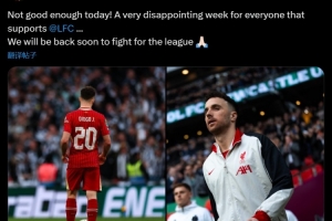 若塔曬出自己的比賽照,并表示:“今天的表現(xiàn)不夠出色!對(duì)于所有支持利物浦的人而言,這是非常令人失望的一周…我們將很快重整旗鼓,為聯(lián)賽而戰(zhàn)?!?/p>