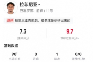 體育資訊3月17日訊 巴薩在本輪西甲4-2逆轉(zhuǎn)馬競,拉菲尼亞本場數(shù)據(jù)如下: