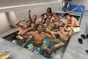 此役過(guò)后,巴薩少賽一輪與皇馬同積60分,排名西甲榜首,巴薩球員們賽后在浴池里合影,慶祝勝利。
