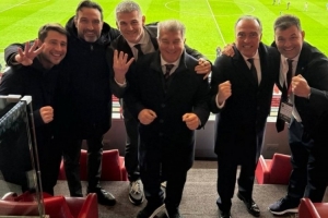 包括主席拉波爾塔在內(nèi)的一眾高層賽后在現(xiàn)場合影留念慶祝,多人手中還比出了“4”的手勢。