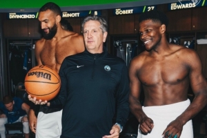 賽后全隊(duì)在更衣室為芬奇慶祝,后者也拿到了比賽用球。愛德華茲和戈貝爾更是僅僅裹著一條浴巾就和芬奇合影,老將英格爾斯也擁抱送上祝賀。
