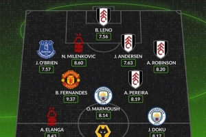 后衛(wèi):奧布萊恩(埃弗頓,7.57分)、米倫科維奇(諾丁漢森林,8.60分)、約西姆-安德森(富勒姆,7.63分)、羅賓遜(富勒姆,8.20分)