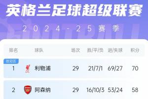 目前利物浦和阿森納均29輪賽罷,利物浦70分,領(lǐng)先阿森納12個(gè)積分,聯(lián)賽還剩下9輪。