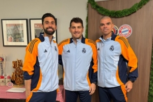 賽前,代表皇馬傳奇隊出戰(zhàn)的卡西、佩佩、阿韋羅亞合影留念,三人曾攜手幫助球隊拿到第10座歐冠冠軍??ㄎ鳜F(xiàn)年43歲,出道于皇馬,2015年離隊;佩佩現(xiàn)年42歲,2007年-2017年效力皇馬;阿韋羅亞現(xiàn)年42歲,出道于皇馬,并于2009年-2016年回到皇馬效力。