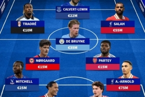 前鋒:特勞雷(富勒姆,1000萬)、勒溫(埃弗頓,2200萬)、薩拉赫(利物浦,5500萬)