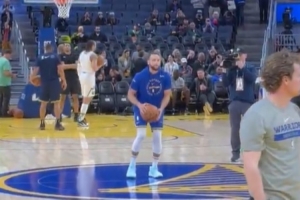 本場(chǎng)庫(kù)里確定出戰(zhàn),他在賽前熱身中小試牛刀,中圈三分3投2中。