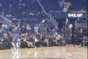 本場庫里確定出戰(zhàn),他在賽前和助教Bruce Fraser玩起了很新的熱身方式。助教高拋傳球,庫里背身接球后轉(zhuǎn)身三分穿網(wǎng)而過。