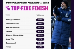 體育資訊3月18日訊 數(shù)據(jù)機(jī)構(gòu)OPTA使用超級計(jì)算機(jī)預(yù)測了英超目前第3名之后球隊(duì)最終獲得前五名的概率,諾丁漢森林最被看好。