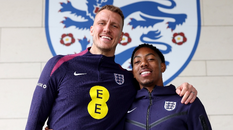 32歲的丹-伯恩與18歲的斯凱利首次入選英格蘭隊,工作人員為兩人拍攝合照,丹-伯恩2米01、斯凱利1米78,兩人的“最萌身高差”被狠狠調(diào)侃。