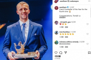 西漢姆官方賬號也轉(zhuǎn)發(fā)了該消息,并配文:“第4次當(dāng)選捷克足球先生。祝賀你,紹切克!”
