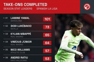 體育資訊3月19日訊 國家隊比賽周到來,西甲也暫時告一段落,squakwa統(tǒng)計了本賽季西甲成功過人情況,亞馬爾斷崖領(lǐng)跑。