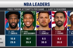 恩比德 場均10.8次罰球(場均29.6分)