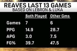 東詹一起出戰(zhàn) 搭檔里夫斯共7場比賽 后者場均14.9分3助 命中率39.7%