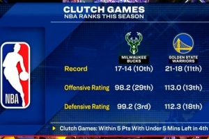 比賽末節(jié)雙方比分緊咬,轉(zhuǎn)播方曬出兩隊(duì)本賽季關(guān)鍵時刻的數(shù)據(jù):