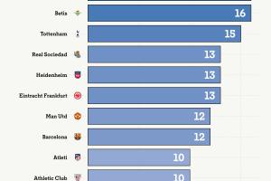 TA統(tǒng)計(jì)了本賽季歐洲4大聯(lián)賽球隊(duì)的休息情況,皇馬有16場(chǎng)比賽賽前休息時(shí)間不多于72個(gè)小時(shí),與貝蒂斯并列最多,前十中西甲球隊(duì)有6支。