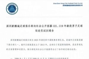 深圳新鵬城足球俱樂部公開招募U21、U19、U17年齡段男子足球運動員試訓(xùn)通告