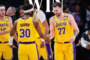 NBA常規(guī)賽,湖人在主場120-108擊敗掘金。賽后湖人曬出贏球海報,東契奇、里夫斯、古德溫、海斯登上封面。