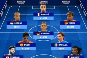 前鋒:西蒙斯(8000萬歐)、姆巴佩(1.6億歐)、亞馬爾(1.8億歐)