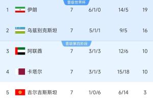 伊朗和烏茲別克斯坦位于直通區(qū),領先3/4名6分;附加賽區(qū)阿聯(lián)酋和卡塔爾10分,領先5/6名7分,基本穩(wěn)進下一階段。吉爾吉斯斯坦和朝鮮一個3分一個2分,基本出局。