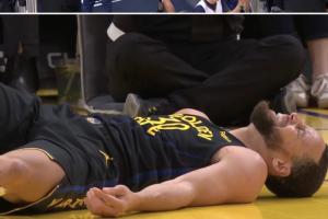 比賽第三節(jié),庫里在一次籃下對抗之后倒地摔到尾椎骨,非常痛苦。隨后庫里在隊醫(yī)陪同下返回更衣室。
