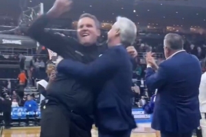 這也是麥克尼斯州立大學(xué)校史在瘋狂三月拿下的第一勝,賽后,麥克尼斯州立大學(xué)的教練瘋狂揮拳慶祝。