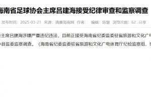 體育資訊3月21日訊 據(jù)海南省紀(jì)委監(jiān)察委官網(wǎng)通報(bào),海南省足球協(xié)會(huì)主席呂建海涉嫌嚴(yán)重違紀(jì)違法,目前正接受海南省紀(jì)委監(jiān)委駐省旅游和文化廣電體育廳紀(jì)檢監(jiān)察組紀(jì)律審查和瓊中縣監(jiān)委監(jiān)察調(diào)查。