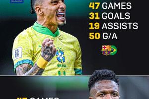 拉菲尼亞本賽季各項賽事數(shù)據(jù):47場31球19助,直接參與50球