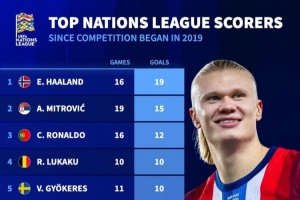 體育資訊3月21日訊 歐國(guó)聯(lián)賽事戰(zhàn)火重燃,《轉(zhuǎn)會(huì)市場(chǎng)》也統(tǒng)計(jì)了歐國(guó)聯(lián)歷史射手榜,哈蘭德居首。