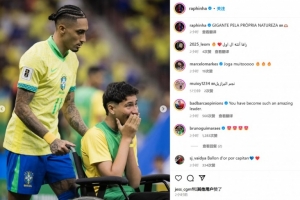 拉菲尼亞也通過社媒曬出自己賽前為殘障球迷手推輪椅的照片,并配文:“他們在心靈層面是巨人?!?/p>