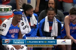 本場比賽雷霆全員發(fā)揮,全隊共有13個人有得分入賬,創(chuàng)本賽季新高,其中更是有8人得分上雙!