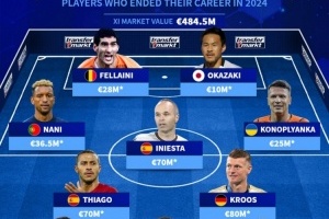 德轉(zhuǎn)列2024年退役陣容(巔峰德轉(zhuǎn)身價,總價4.845億歐):