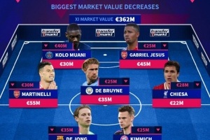 體育資訊1月1日訊 德轉(zhuǎn)列出了2024年身價(jià)下滑陣容,德布勞內(nèi)、德容、基米希、熱蘇斯、穆阿尼在列。