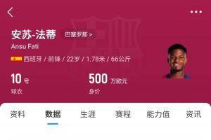 體育資訊03月22日訊 昨日德國(guó)轉(zhuǎn)會(huì)市場(chǎng)更新西甲球員身價(jià),22歲的法蒂身價(jià)再度下跌,僅剩500萬(wàn)歐,僅為巔峰時(shí)期8000萬(wàn)歐的十六分之一。