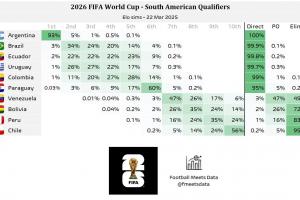 體育資訊03月22日訊 2026世界杯預(yù)選賽南美區(qū)已進(jìn)行到第13輪,數(shù)據(jù)機(jī)構(gòu)Football Meets Data給出了各隊(duì)最新的晉級(jí)概率。